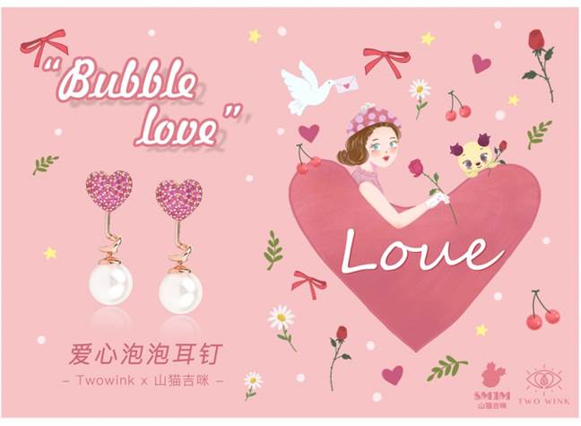 爱心泡泡系列首饰选取Two wink品牌的DNA元素-心形作为切入点,心形象征爱情,泡泡营造浪漫的气氛,爱心泡泡的两戴设计更适合不同场景的搭配。
