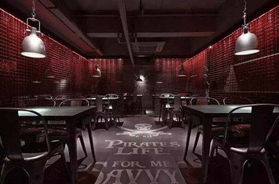 杰克猫主题烤鱼餐厅核心区域由船型造型组成,翘起的船头和船尾,印证着航海家们迎风斩浪的豪情壮志,中心高高竖起的桅杆,飞舞的白帆,粗粗的绳索,无数细节旨在让顾客有身临其境的航行感受。极具特色的桌子,和印有世界各国风情的座椅图案,与航行的主题紧紧相扣,船上座椅的设置,私密而宽松,使每一位登船的客人都能坐的舒适。