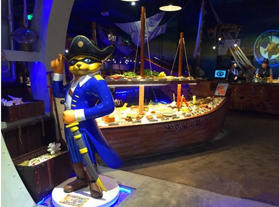 航海文化主题餐厅,每到就餐时间,门店外总是排着长队等待就餐。主题餐厅,餐厅的装修、摆设、造型以杰克猫为特色来布置。墙上的甲骨文是猫的进化史,手绘地图是杰克猫航行的路线,蓝色的光影流动,与餐厅蓝色的海洋装修风格相呼应,再加上流动的海水,让餐厅的海洋风味更浓烈。
