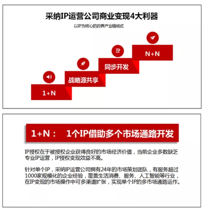 IP的价值在于IP构建全产业生态,同时具备专业的IP运营与变现。东莞采纳品牌运营管理有限公司,构建品牌升级助力实体企业发展,解决头部IP被寡头垄断授权费用高跨门槛难,打造真正意义上的带有知识产权属性的国际化授权转化平台,加速IP全产业链的超值变现,提升企业品牌影响力,提升企业销量。