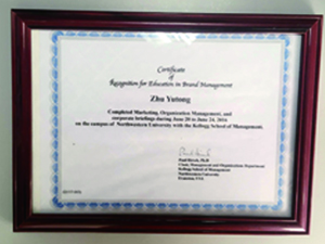 查看详情热烈祝贺采纳总经理朱玉童荣获美国西北大学凯洛格商学院品牌管理结业证书 2016年6月中旬,采纳总经理游学美国西北大学期间完成西北大学凯洛格商学院品牌管理课程的学习后光荣结业,并取得凯洛格商学院颁发的品牌管理课程学习的结业证书! 朱玉童用自己的行动向采纳人诠释着活到老学到老的企业文化!