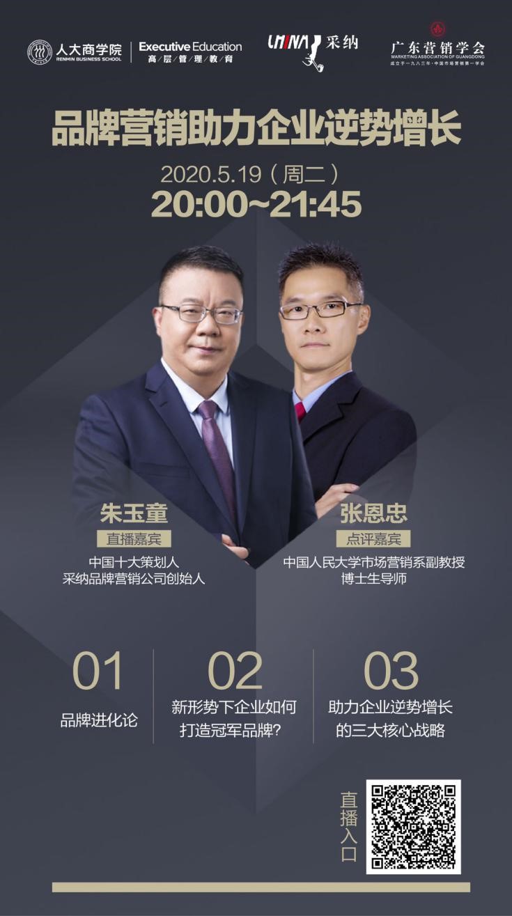 2020年5月19日晚上8点,由人大商学院联合深圳采纳品牌营销顾问有限公司及广东营销协会共同发起“品牌营销助力企业逆势增长”的线上直播课程,由中国十大策划专家、采纳公司创始人朱玉童先生担任分享嘉宾,人大商学院副教授张恩忠老师担任点评嘉宾。