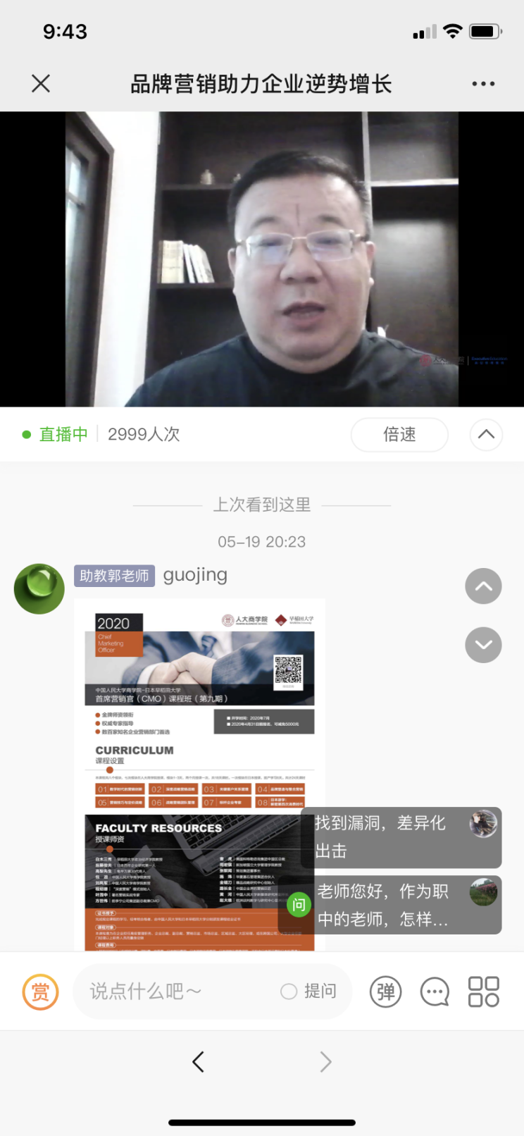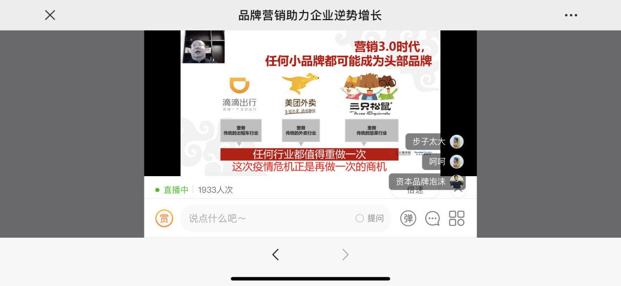 直播最后,线上的企业家也纷纷向朱老师提出企业目前遇到的经营和营销上的难题,朱老师一一作答,原本1个半小时的线上直播课程也因此延长了30多分钟,大家都纷纷表示意犹未尽,人大商学院也表示,希望朱老师在疫情彻底结束后能在线下给企业家朋友们做一些现场讲座。
