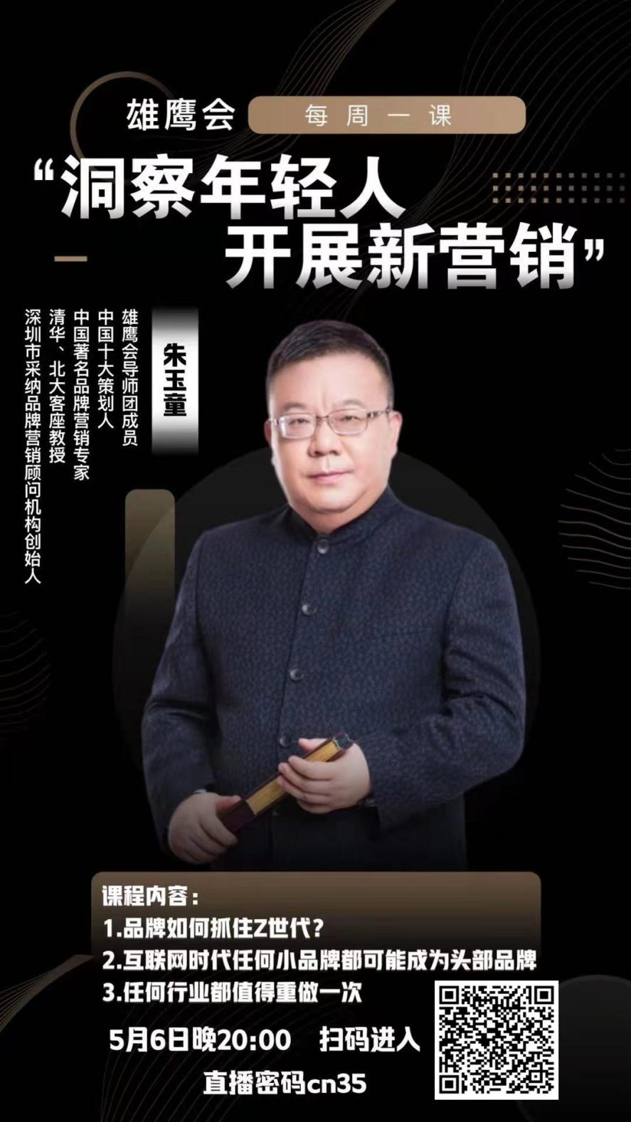 2021年5月6日晚八点,雄鹰会每周一课线上直播“洞察年轻人开展新营销”实战课准时开讲,中国十大策划人、著名品牌营销专家、深圳市采纳品牌营销顾问公司创始人朱玉童先生受邀为本周品牌课的主讲老师。