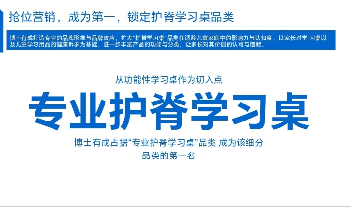 ? 品牌卡位:放弃“通用学习桌”混战,聚焦“专业护脊学习桌”新品类,喊出“护脊学习桌=博士有成”;