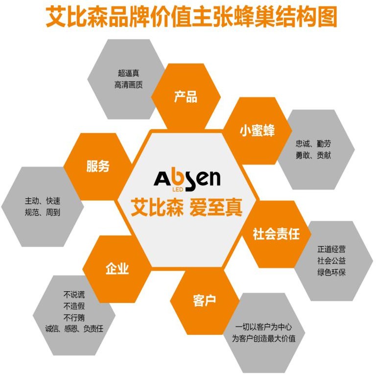 采纳项目组通过深度调研发现,国内LED显示屏市场普遍存在“弱服务”现象,随着小间距技术愈发成熟,在满足显性需求的基础上,能拓宽对于隐性需求的最大量化,而“服务”成为市场上考虑的重要因素之一;同时,艾比森多年来孕育的企业文化,即“不说谎、不造假、不行贿”,也与行业内其他品牌形成区隔。基于此,在行业趋势、企业自身等多层次、多方位综合考量下,我们另辟蹊径,以“文化+服务”的形式定位艾比森,锁定企业至真文化,将企业原有的价值金三角融入其中,打造属于艾比森的“真文化”品牌价值体系,提出“四真六爱”理念,爱员工、爱企业、爱客户、爱产品,企业真、客户真、产品真、服务真、社会责任真、形象真,更深层次演绎至真文化,并通过价值主张蜂巢结构图将品牌文化生动体现,使之从口号变成行动指南。