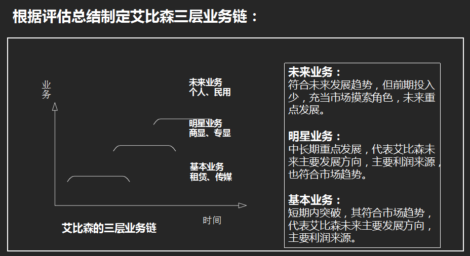 2.艾比森项目采取艾比森业务三层次战略,对基础业务、明星业务、未来业务进行规划,针对不同板块进行全面布局,明晰品牌战略方向。