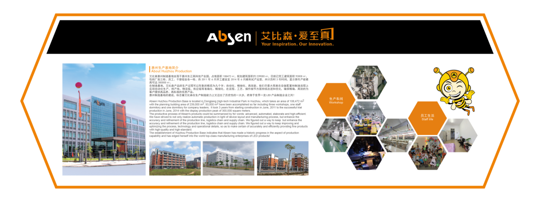 接下来,采纳为艾比森重塑品牌形象——超级IP小蜜蜂小艾,象征艾比森公司所推崇的严谨工作、互助、共享、勤劳、拼搏共赢的精神,用汗水与付出回馈社会。