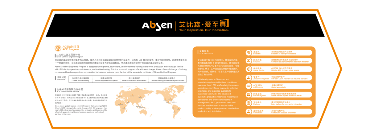 有了策略,就要坚定地落地执行。在经过完整的品牌战略体系包装之后,艾比森也迅速将品牌战略全面贯彻落地落地,在企业内部:企业文化墙——案例合集、企业文化墙——ACE培训、办公楼文化墙等都能看到艾比森全新的品牌文化;在企业外部采纳提炼四个一:一场行业权威媒体主办的十佳品牌推介会;一次艾比森全球营销年会;一场最重要的行业展会;一场符合国内市场趋势的小间距与智慧城市高峰论坛。与会期间,参会人员对艾比森全新的品牌理念给予了高度认可。品牌与营销相结合,是让品牌的拉力与营销的推力形成合力,加速中国市场的渠道构建与销量提升。