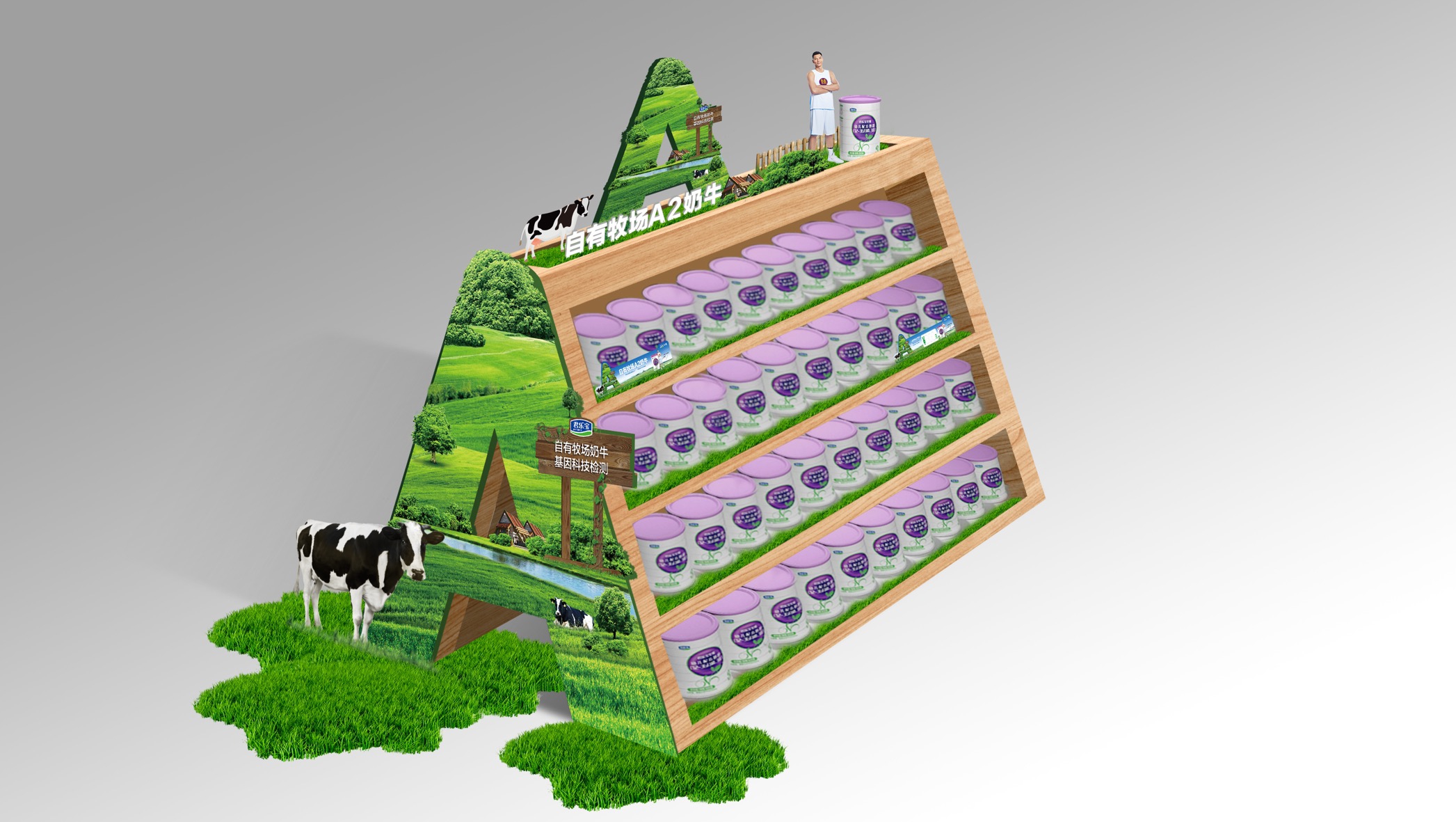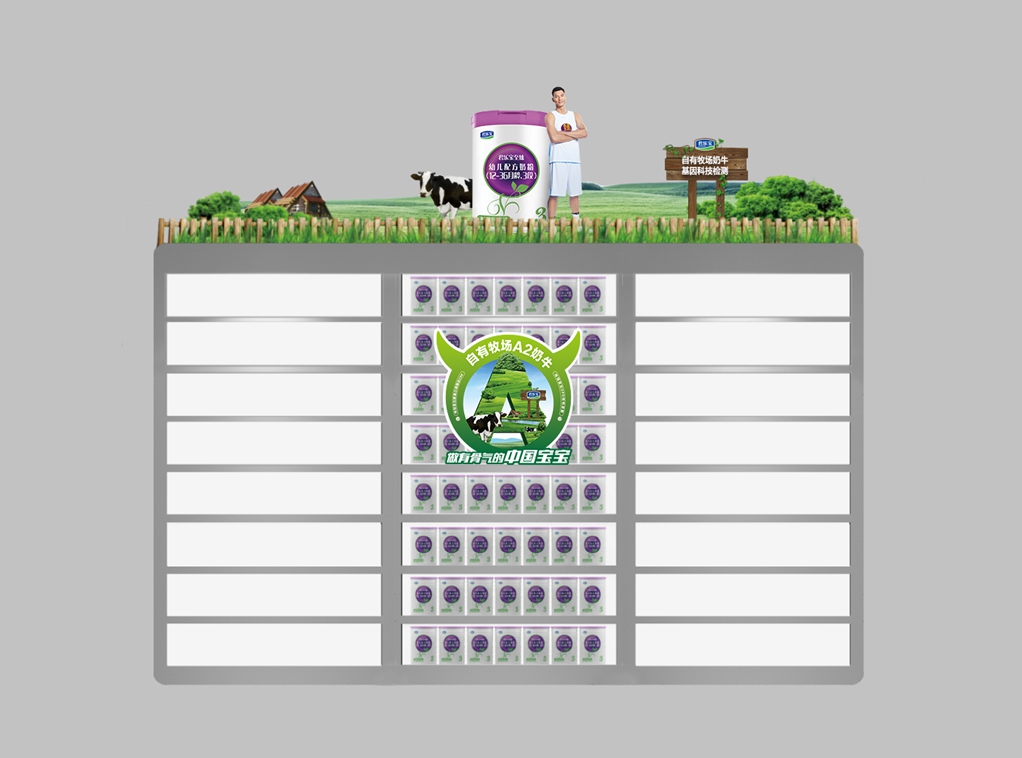 我们的策略:在A2为妈妈所熟悉的情况下,她如果再次去买A2奶粉,零售终端就是品牌体验和消费拦截的最佳场所,而视觉锤是实现拦截的重磅武器,用代表A2奶源的“A”结合立体天然牧场,打造“A2奶牛牧场”的独特视觉锤,把“自有牧场A2奶牛”的品牌价值像钉子一样打进消费者的心智,并将视觉锤贯穿整个终端设计,从海报到产品展示,不断强化君乐宝至臻就是“A2奶牛奶粉”的视觉记忆,让妈妈在终端改变了自己的品牌意愿,最终选择了君乐宝!