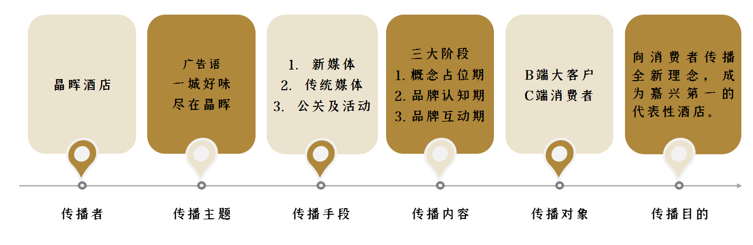 整合传播节奏(围绕晶晖酒店“江南美食”特点,将“一城好味,尽在晶晖”作为整合传播的主题。针对B端和C端不同类型的客户,三大阶段,概念的占位、品牌认知、品牌互动,层层递进,围绕全新的品牌规划价值体系,进行有针对性、有效性的输出内容,向消费者传播全新理念,从而带动酒店口碑的提升。)
