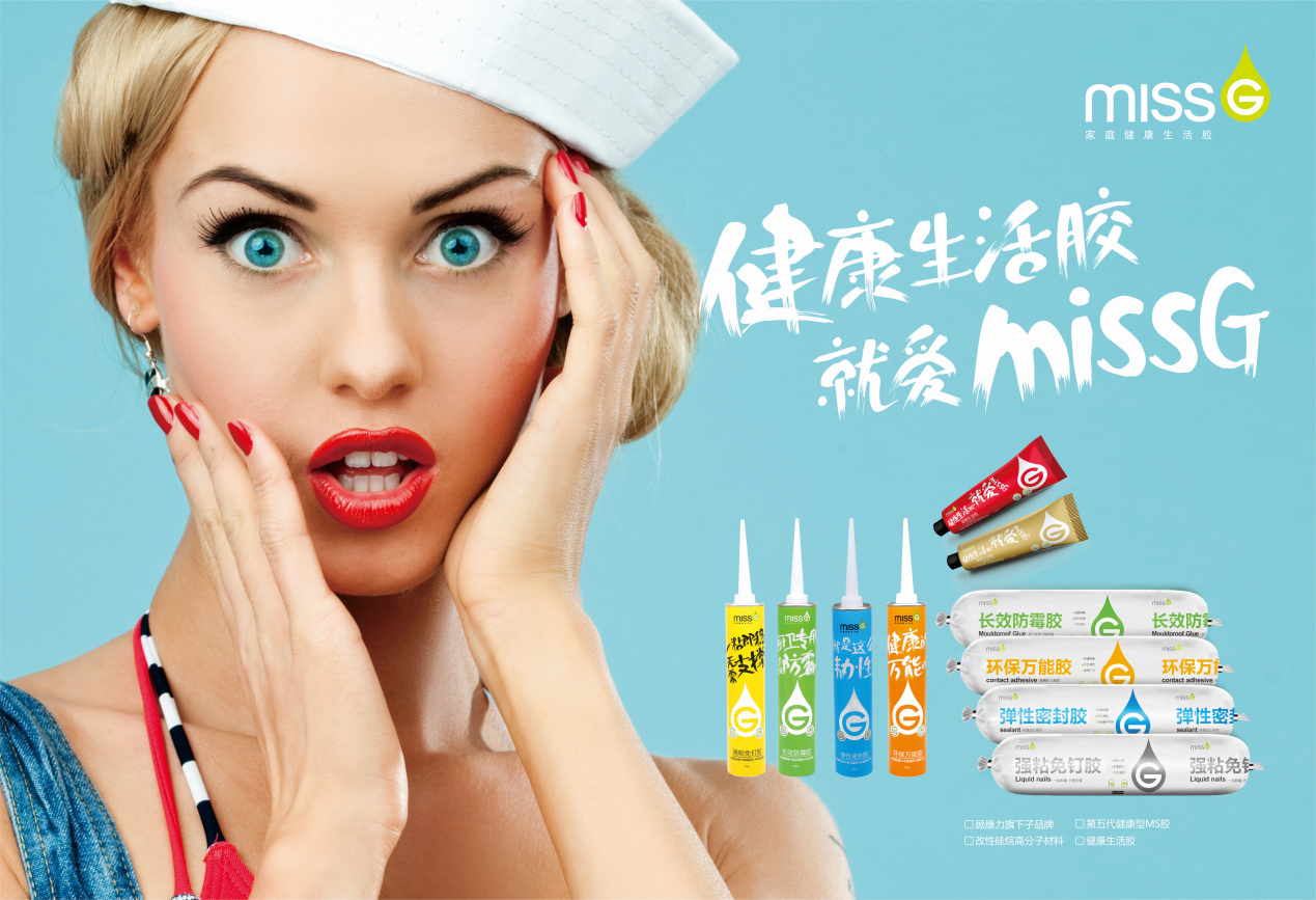 从MS胶健康环保的气质、超强的粘力、对生活的帮助的角度,采纳为MS胶塑造了健康亲和、富有爱心、清新粘人的年轻美女的形象,为其创意英文品牌名——“MISS G”,中文命名“G小娇”。
