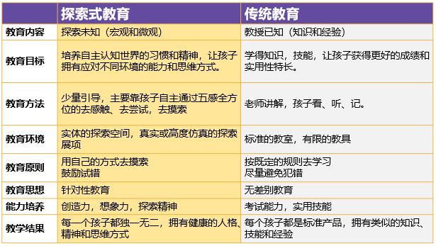 ② 探索式教育的内容:根据儿童在0-12岁期间的成长规律,科学设置探索项目、课程和教学方式,让儿童通过自主探索的形式,亲手感触世界,高效掌握知识,养成认识未知的习惯和探索的精神,并通过探索发现儿童的兴趣和天赋,针对性培养。