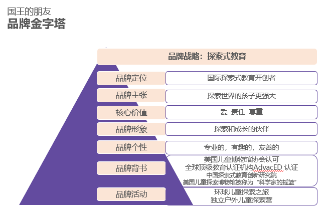 运用采纳品牌策略工具:品牌金字塔,为国王的朋友建立品牌资产体系,用简洁有力的话语由内向外传递国王的朋友的理念与价值。