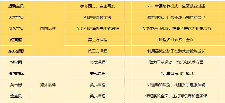 首先是早教,国际品牌以国外的一些理论为基础,开发一些课程,具有一定的系统;而国内早教品牌的课程多数为整合多个第三方机构的课程,在课程内容上严重同质化。