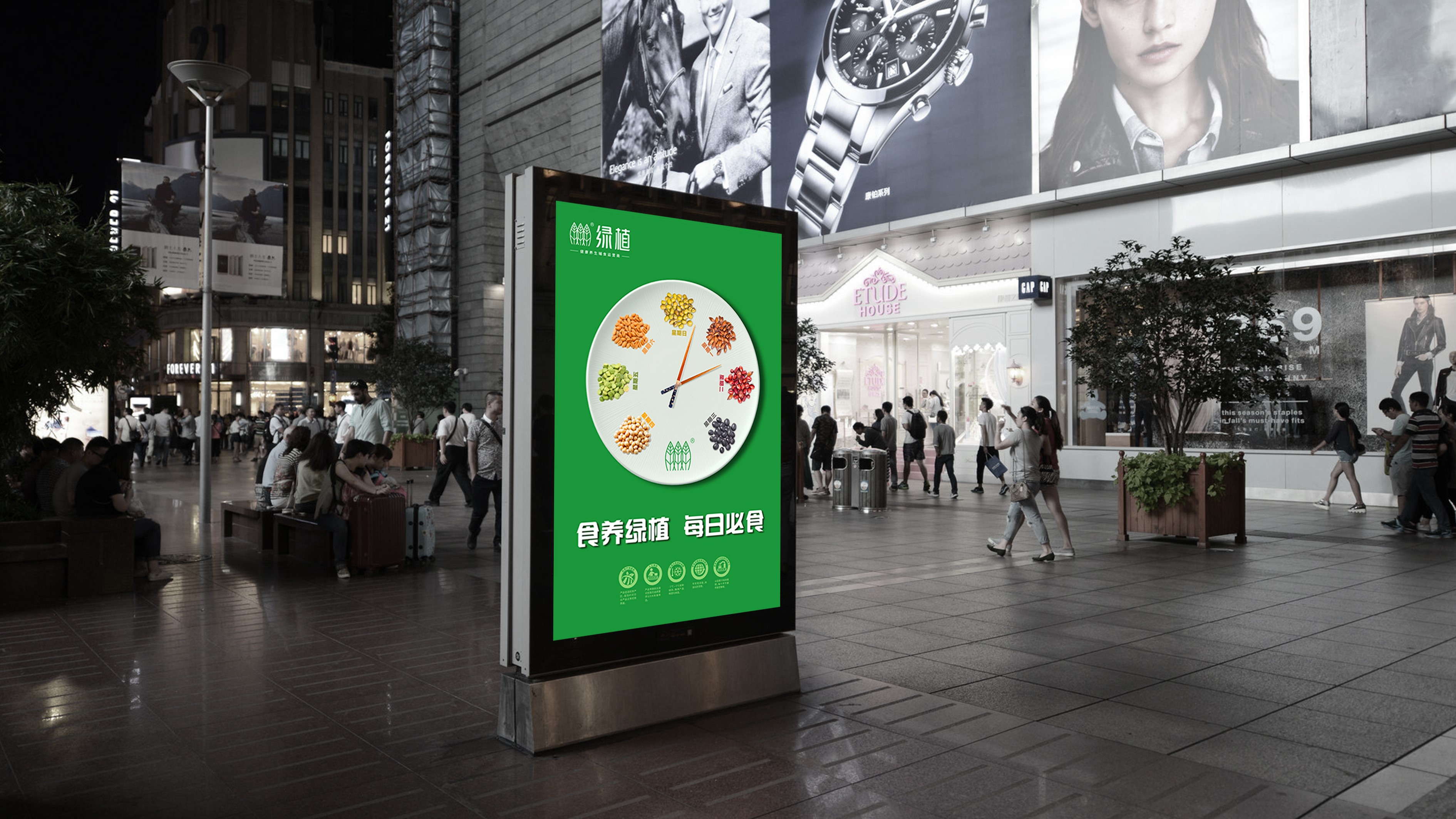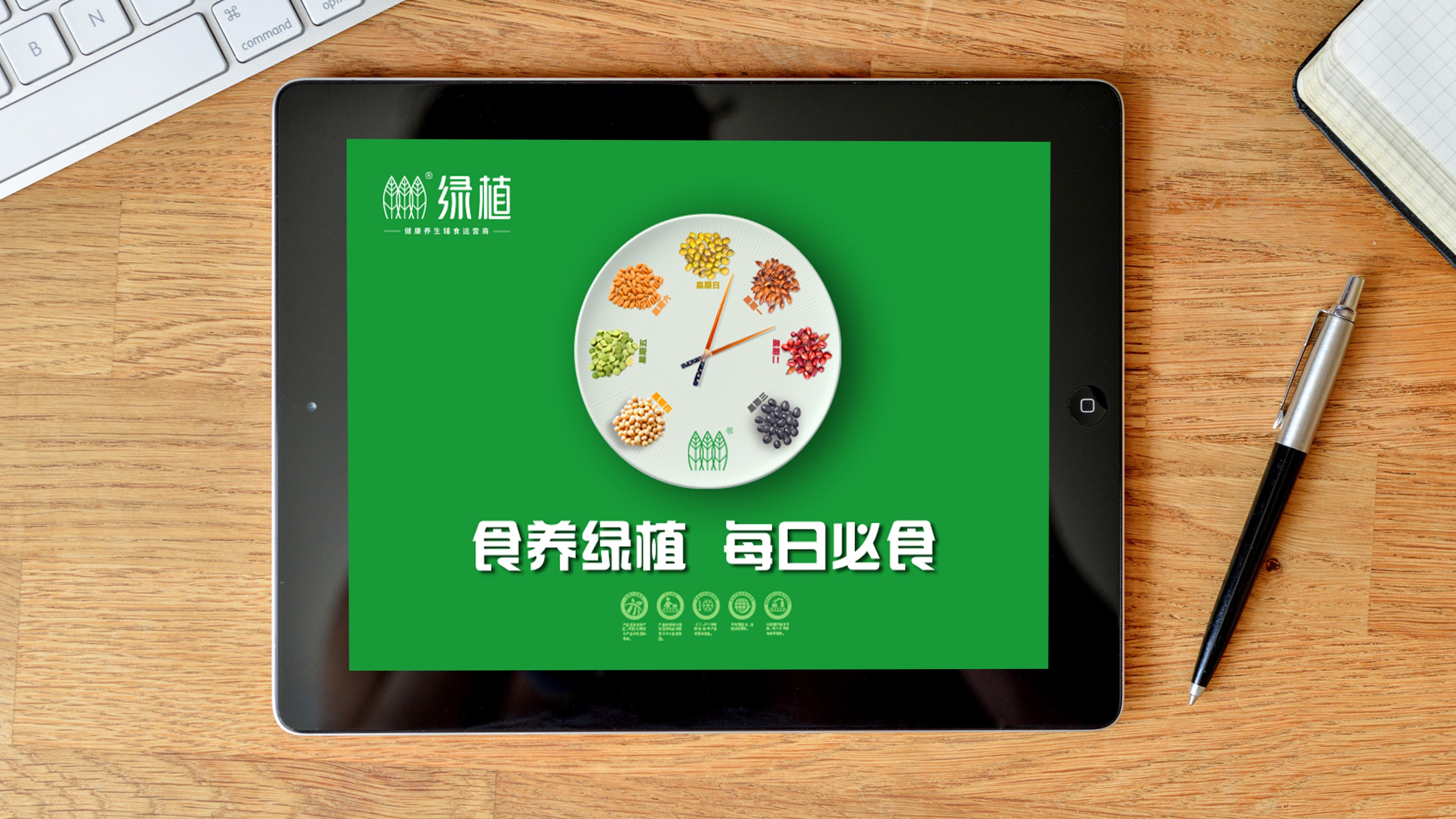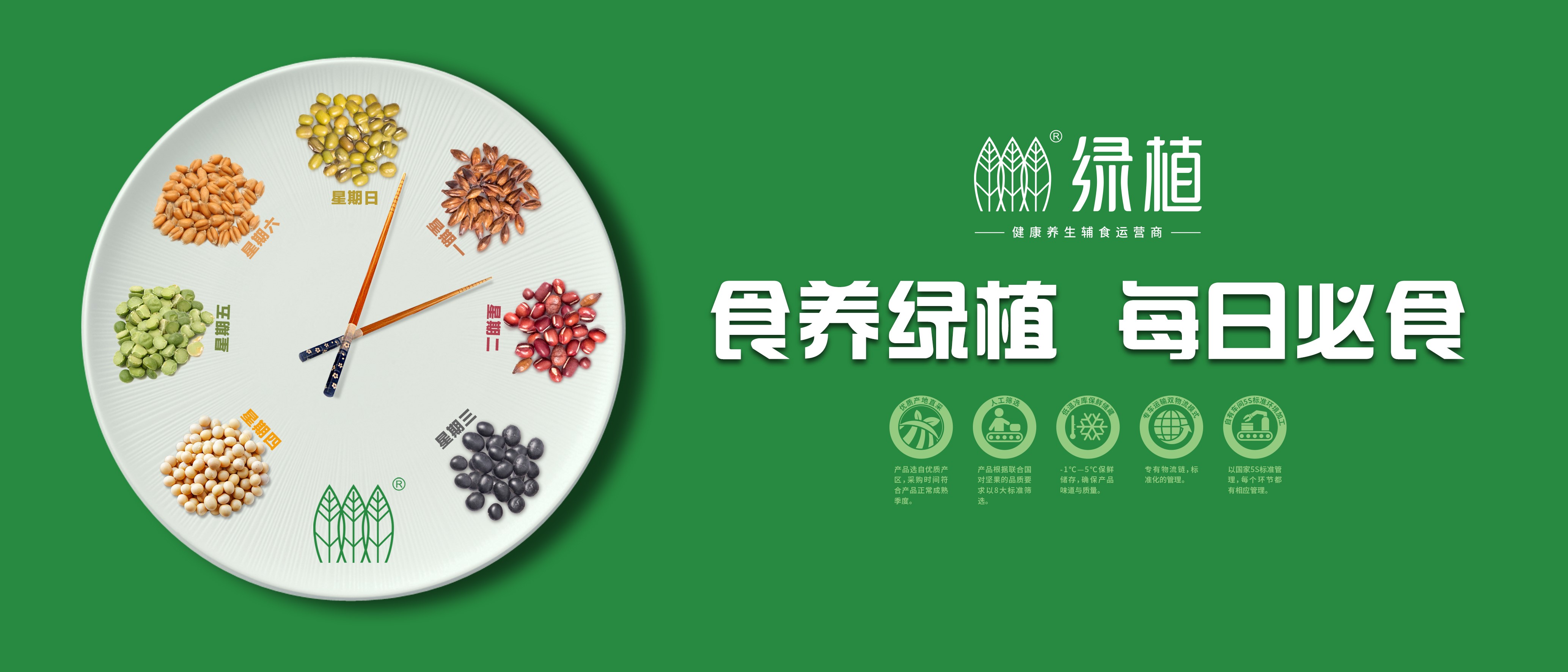 品牌传播首先是要给受众留下印象,继而说服。为了把“食养绿植,每日必食”的语言钉子锤进消费者心智,我们用时间概念设计了一个每日食谱的“视觉锤”,星期一吃麦子,星期二吃赤豆,星期三吃黑豆……