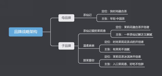 关于茶仙记品牌战略,采纳使用金字塔理论帮助茶仙记构建品牌架构及梳理品牌价值。作为母品牌的茶仙记,定位为“快时尚融合茶”品牌,主张“年轻·中国茶”,其旗下子品牌分别为茶仙记爱的茉莉香(茶饮品牌)、温柔麻麻(烘焙点心品牌)、那茉爱你(冰淇淋品牌)。
