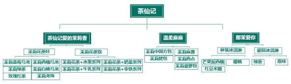 基于此,采纳使用金字塔战略体系为茶仙记爱的茉莉香搭建品牌战略架构,将品牌核心定位聚焦于“茉莉花融合茶开创者”,打出 “一杯茶仙记解乏又解腻”主张,采用茉莉之乡——横县的茉莉花茶非遗传人出品原材,研发开创独有的茉莉花茶+水果、茉莉花茶+牛乳、茉莉花茶+奶盖、茉莉花茶+拿铁等系列茶饮、茶叶、冰淇淋、烘焙点心。