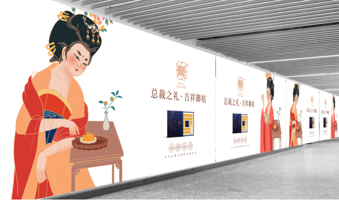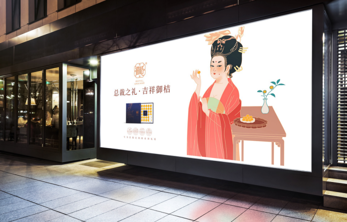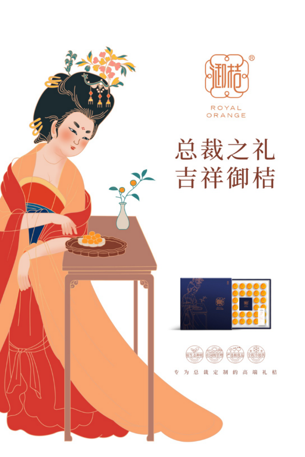 为夯实御桔的唐贡文化,采纳给御桔找一位代言人——杨贵妃,打造“贵妃品桔”的品牌视觉锤,用人们熟知的大唐超级符号,将“皇家礼桔、高端礼桔”的钉子砸进消费者认知。