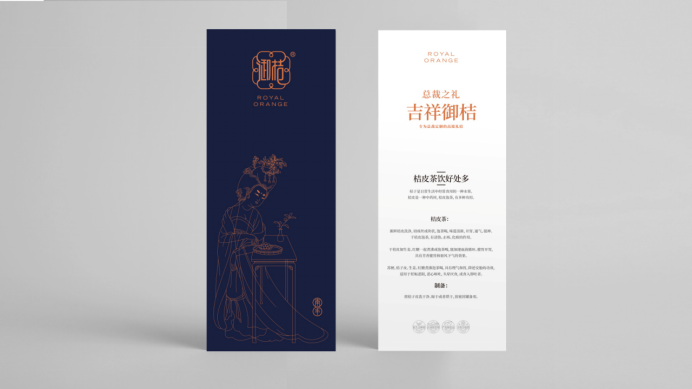 在色彩策略方面,采用皇家御用的藏青色和桔黄色搭配,让御桔与众不同,“御”味十足。