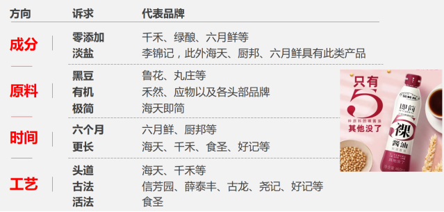 更残酷的是,除了“六个月发酵”和“零添加”分别被先发且聚焦的六月鲜和千禾占领之外,其他诉求均已成为共性资源,不在具备区隔意义。