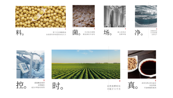 除了品类核心的四本标准之外,我们还设计了本酿造酱油七大品质规范:料、菌、场、净、控、时、真,这既是长寿花酱油的产品价值,也是本酿造品类的护城河。