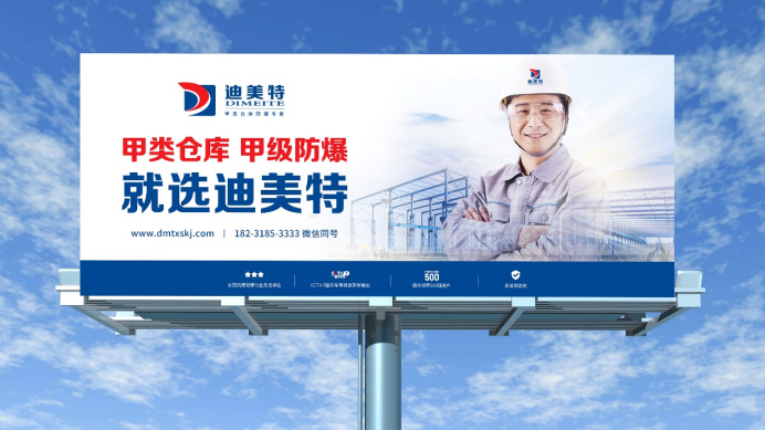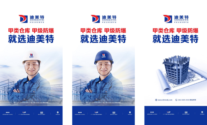 品牌层面,经过多轮创意梳理多方考量,采纳决定让迪美特立足自身最大、最强,同时也是市场需求最广泛的仓库产品类别优势,以“甲类仓库抗爆专家”的品牌定位即品牌身份进入客户的心智中,占据最高防爆级别的同时,树立专业领域的专业形象,在市场还未深化的当下去细分防爆抗爆行业,差异化定位,抢先占据甲级防爆赛道,并确立“甲类仓库 甲级抗爆 就选迪美特”的品牌主张,形成朗朗上口强有力的行动指令。
