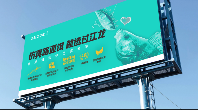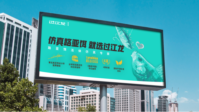 一切的设计都是为了便于让消费者传播。所以在设计呈现上,采纳为过江龙采用了鱼饵+鱼+爱心的组合设计,不仅凸显了过江龙鱼饵的“泳姿仿生、外形仿真”特性,更通过极具吸引力的方式展现了其作为高品质“真”鱼饵的魅力。这一设计不仅便于消费者传播,还在无形中加强了过江龙品牌与消费者之间的情感连接。每当消费者看到那个充满生命力的鱼形和爱心标志,都会想起过江龙品牌的承诺和品质,从而建立起更加深厚的品牌忠诚度。