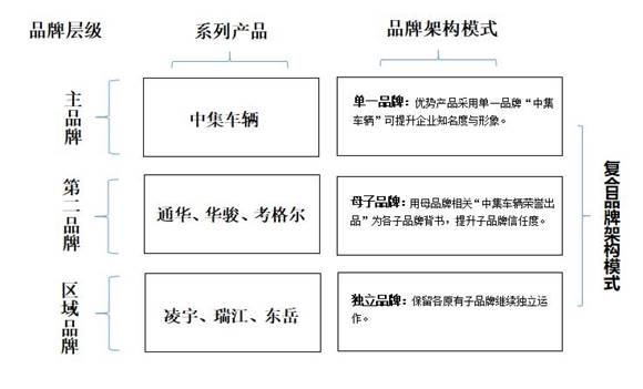 针对中集车辆集团产品多、质量参差不齐的特点,采纳专家认为复合品牌架构模式与中集车辆集团最为吻合。将中集车辆集团旗下产品分为三个层级,针对性的采用不同产品品牌(主品牌、第二品牌、区域品牌),掌控不同层级目标市?。ǜ叨耸谐 ⒅卸耸谐?、低端市场)。达不到中集标准、或者细分市场的第一第二名,允许不使用中集品牌,这样做既?;ち酥屑笃放朴钟欣谄煜伦悠放频姆⒄?。到一定时候,他们发展成熟了,再用中集品牌全面整合!