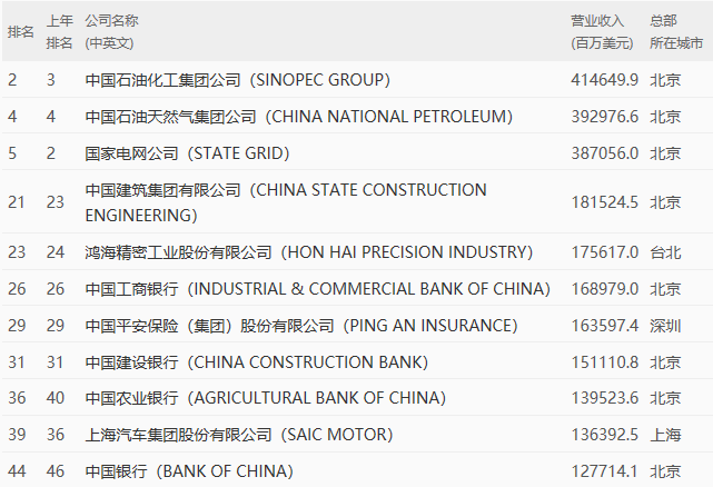 2019年世界500强前50名中国企业