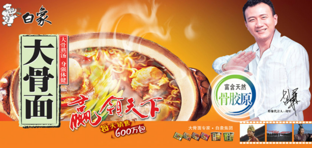 采纳专家经过调研创意,创意出了白象大骨面,并且对白象大骨面进行了区隔定位:大骨熬汤、身强力壮,骨胶原的营养这个层面,凸显了白象大骨面的价值,因此推出了广告语白象大骨面,大骨营养在里面”,该品类获得了极大的成功,当年带动白象销量突破9亿。
