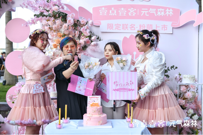 采纳品牌团队运用C战略的聚焦原则,聚焦在新生代女性群体,策划壹点壹客与元气森林春季联名款“少女樱?!毕盗械?,借助“炒CP”话题,引发年轻消费者关注,为壹点壹客吸引到更多流量从而变现。线下举办的粉丝见面会更是邀请数百位达人一起庆祝生日,品鉴新品蛋糕与新口味气泡水,口味完胜,颜值爆表。